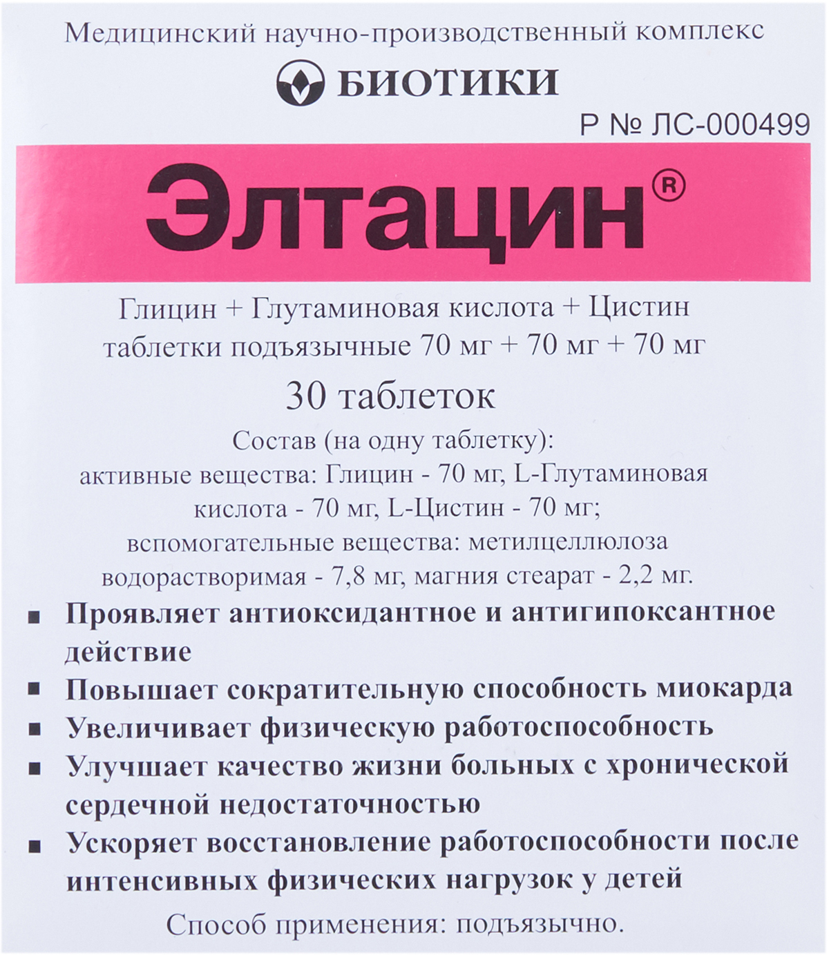 Элтацин — это антиоксидантное средство на основе заменимых аминокислот. Препарат регулирует обмен веществ, повышает устойчивость сердечной мышцы к кислородной недостаточности, а также улучшает сократительную способность миокарда и общее состояние здоровья пациентов с сердечной недостаточностью. Подъязычные таблетки необходимо держать во рту до полного их растворения.